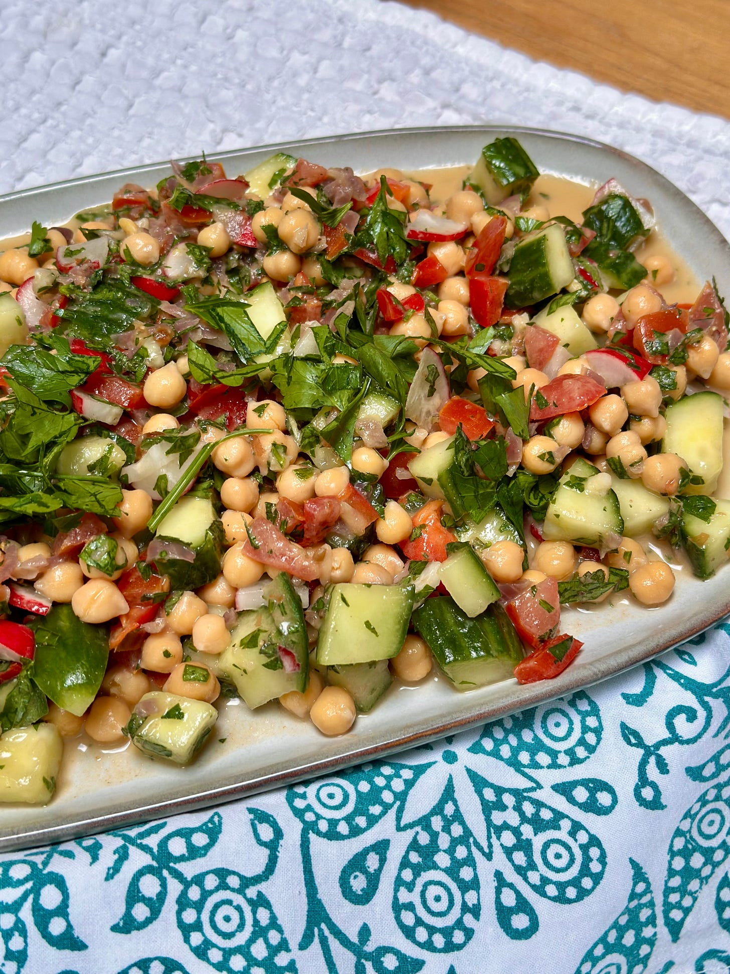 As for chickpeas — I don’t know if I ever truly fell in love with them. We tolerate each other. 😊 I’ve learned to use them in ways that work for me: roasted until crispy as a topping, or sitting quietly in the background of a Mediterranean tomato dish. In a salad like this one, I make sure they have time to soak up the dressing, and I chop everything to a similar size so you get all the flavours in one bite. That makes all the difference.