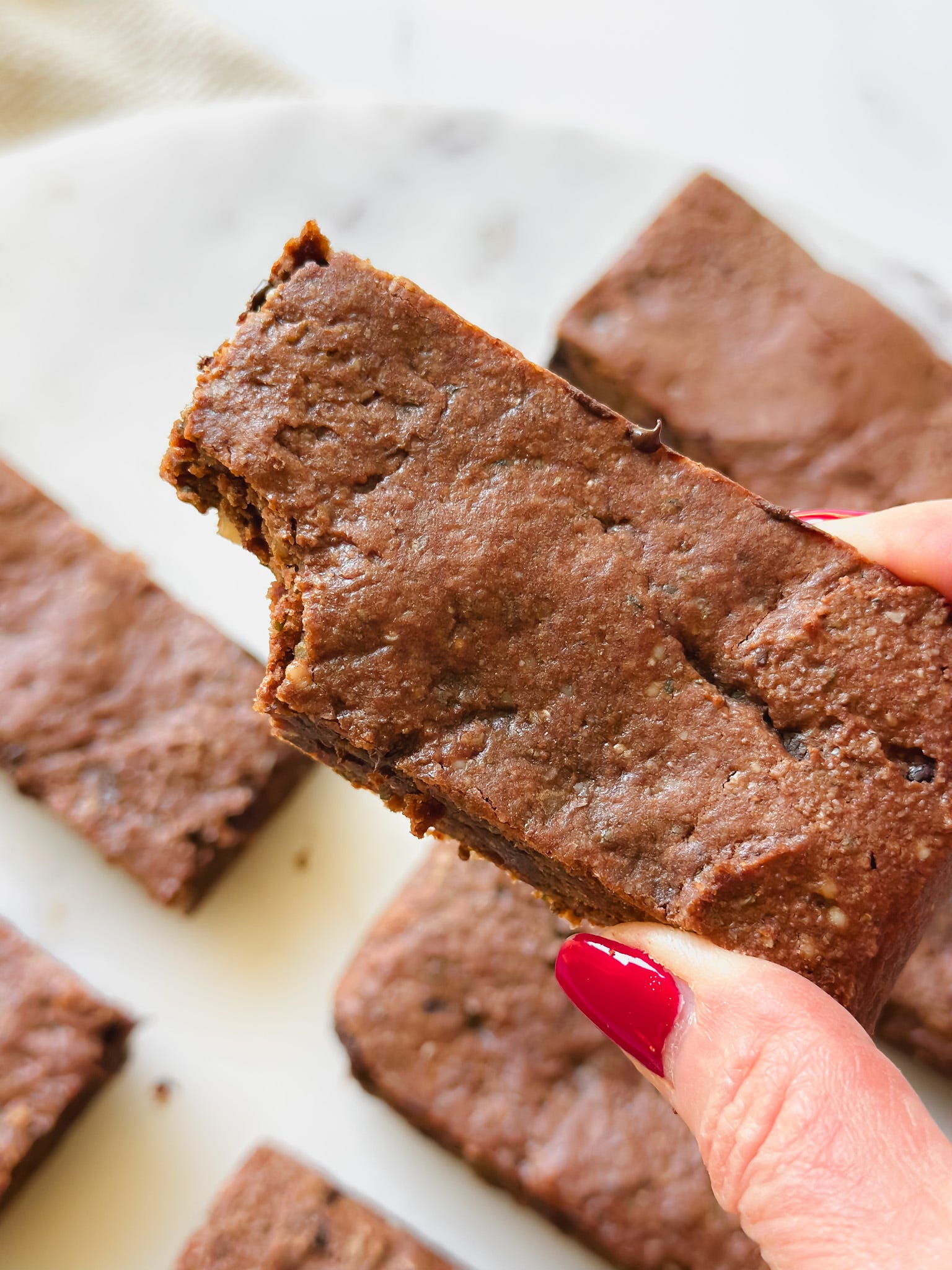 I spent a lot of time perfecting this recipe, and I hope you love the final result– the perfect combination of fudgy, rich, satisfying, and blood sugar-friendly. Each brownie bar contains 11 grams of protein and 7 grams of fiber, so if you're aiming for closer to 30 grams of protein at breakfast, 2 bars along with a scoop of collagen in your morning coffee or tea will get you there!